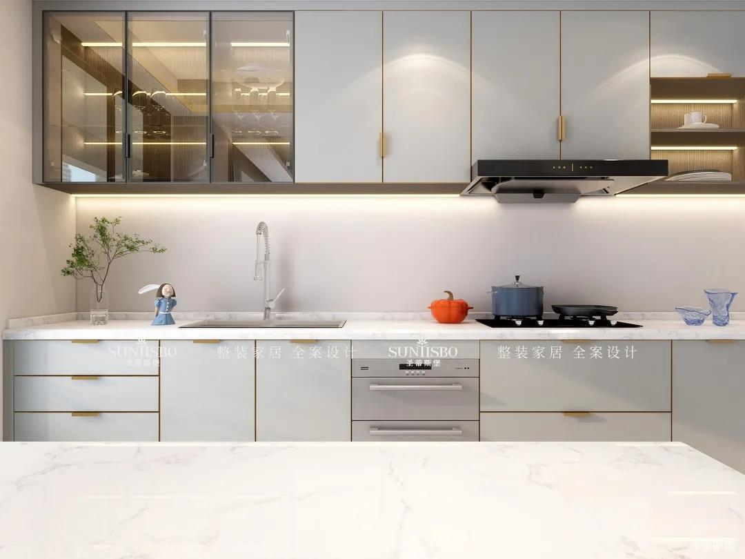 厨房现代智能的设计对精致生活进行了全新的诠释,同时也呈现了居者追求精简生活的内涵。智能的厨房电器嵌入同色系的柜体中,时尚科技感十足。