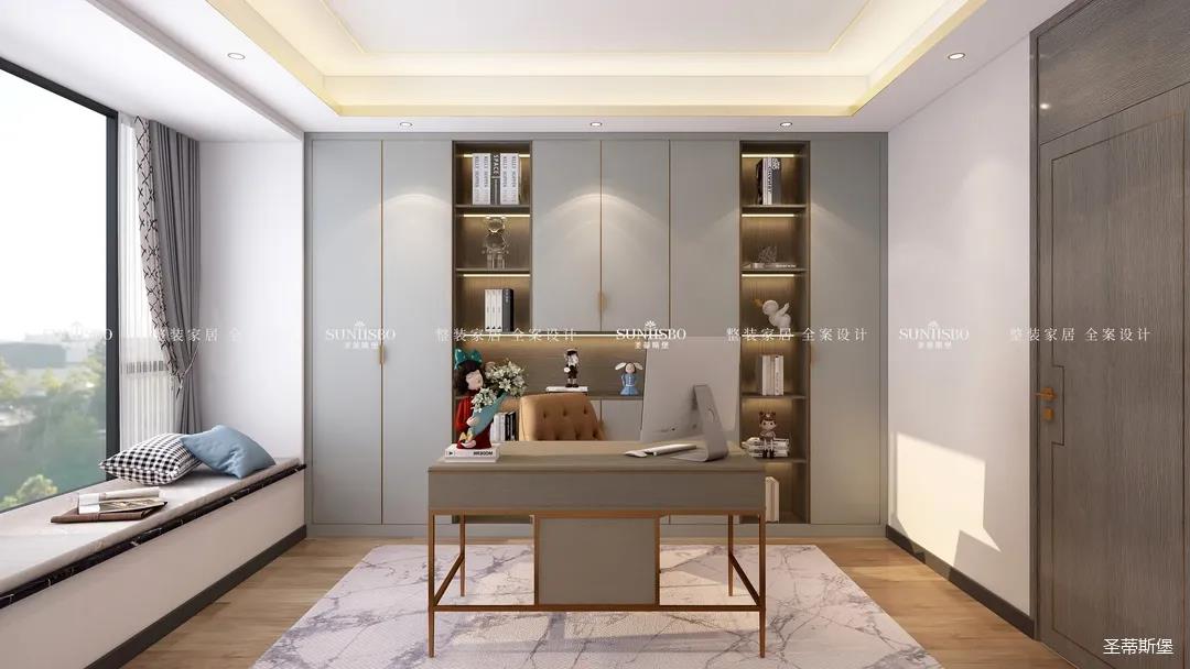 书房以浅灰作为主色调,设计师在整个空间没有选择其他颜色进行相互杂糅,让书房完全释放了简约的风格,无主灯的设计理念更是突出了空间层次感。细腻且富有光泽的金属元素镶嵌,在繁华的都市中传递着特有的文化氛围。
